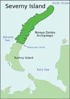 Severny Island is separated from Yuzhny Island (Southern) by the narrow Matochkin Strait. Forty percent of the island is covered by the Severny Island ice cap, which is the largest glacier by area and by volume in Europe (if counted as part of it).[3] Severny Island is known for its numerous glaciers.[4] Cape Flissingsky is the easternmost point of Severny Island.