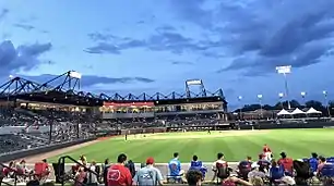 In 2013, the University of Alabama Board of Trustees approved a $30 million full-renovation project for the stadium.[2] While using some existing structures, the renovations essentially create a brand-new stadium. Renovations began immediately following the 2014 season and forced the team to play their home games at the Hoover Metropolitan Stadium during the 2015 season. The project was completed for the start of the 2016 season. Renovations included 12 suites, a new outfield walk that connects with the concourse, a playground and mini infield for families, a pre-game picnic area, team store, commissary, new seats, and an expanded canopy overhang over the primary seating area. New player amenities include a home team locker room and lounge, showers and restrooms, meeting room, weight room, bullpen and a four-lane indoor batting facility. The new seating capacity is 5,800 chair-back seats, plus 2,700 standing room only.