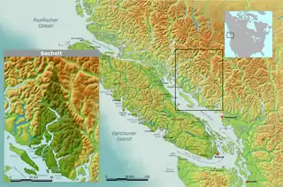 The shíshálh Nation swiya (world, "Territory") is located to the northwest of Vancouver, British Columbia (left inset)