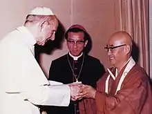Hagami maintained that for the advancement of world peace, Judaism, Christianity, and Islam must be reconciled, and that Japanese Buddhists—as religious people of the first victim of nuclear attack in human history—must serve as mediators for that reconciliation. Accordingly, he visited Egypt and the Vatican many times and established close friendships with the Egyptian President Anwar Sadat as well as with Cardinal Sergio Pignedoli of the Vatican.[6]