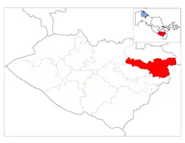 Shahrisabz District (Uzbek: Shahrisabz tumani) is a district of Qashqadaryo Region in Uzbekistan. The capital lies at the city Shahrisabz, itself not part of the district.[1] It has an area of 1,620 km2 (630 sq mi)[2] and its population is 223,800 (2021 est.).[3] The district consists of 13 urban-type settlements (Miroqi, Qumqishloq, Oʻrtaqoʻrgʻon, Chorshanbe, Temirchi, Yangiqishloq, Qutchi, Shamaton, Ammogʻon-1, Qoʻshqanot, Anday, Xoʻjaxuroson, Keldihayot) and 12 rural communities.[1]