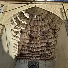 Muqarnas plasterwork visible on the upper part of the entrance to the mausoleum