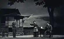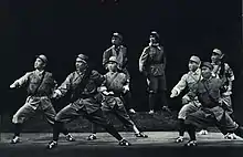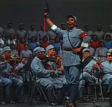 It was first produced as a Shanghai opera entitled Sparks amid the Reeds (芦荡火种) or Emerald Water and Red Flags in 1958 by the Hu Opera Troupe.[7][8] In October 1963, the First Peking Opera Company adapted it as a Peking opera. Mao Zedong saw it in 1964 and asked that the title be changed, as sparks would not set wet reeds alight, so it was named after its setting, the town of Shajiabang ("sands family creek").[9] Jiang Qing (Mao's wife, a leading figure in the Cultural Revolution), insisted that the role of the Red Army political commissar be expanded.[10] The dance routines were also revised, the opera not reaching its final form until 1970.[11][7] Wang Zengqi also contributed to it.[12][13]