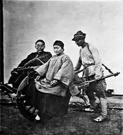 ![]() A Shanghainese man and woman on a wheel barrow, pre-1898. | |
