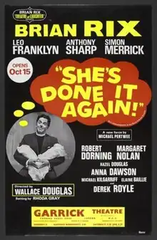She's Done It Again is a 1969 comedy play by the British writer Michael Pertwee. A farce, it ran at the Garrick Theatre in London's West End from 15 October 1969 to 23 May 1970. This marked a shorter run than any of the Whitehall farces that sar Brian Rix had appeared in, although it received better reviews.[1] Aside from Rix the London cast included Margaret Nolan, Anna Dawson, Leo Franklyn, Derek Royle, Robert Dorning, Michael Kilgarriff, Hazel Douglas and Anthony Sharp.[2]