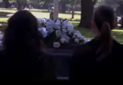 ![]() Meredith Grey (Ellen Pompeo) and Cristina Yang (played by a body double) at Derek's funeral. Sandra Oh did not return for the scene, because she had departed from the series in the tenth season finale. | |