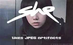 A recurring theme in she's art is that some images seem to be damaged or poorly compressed in certain parts. Just like with the music distortion, the images are designed to give the impression that the file is incomplete, broken and not correctly displayed.