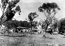 Although camps were set up during the course of the strike from Cloncurry to the New South Wales border, the focus was on Barcaldine and the main camp on the southern bank of Lagoon Creek is said to have held up to 1000 strikers, some of whom were accompanied by their families. They were well organised and set up tents in rows with a cleared area between. Strikers were issued with food, soap, tobacco and salt and an oven made of ant bed was constructed to provide fresh bread. Provision was even made for recreation with a library tent set up and games such as cricket being played. Feelings amongst the strikers ran high and a tree was blazed on the north eastern edge of the camp and painted with the words "United we stand. Divided we fall. A.L.F. the strike camp 1891 W. Vincent, E Car...".[1]