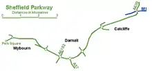 The route runs east of the City, connecting Park Square in the city centre with the inner ring road, outer ring road and out to the M1 motorway at junction 33. It passes the districts of the city council which are former villages: Wybourn, Darnall and Handsworth and the large village of Catcliffe, at which a slip road connects to Sheffield Business Park and the Advanced Manufacturing Park (AMP). At Handsworth the road passes through Bowden Housteads Woods, where it is possible to see the Parkway Man statue.[1] Many businesses and Sheffield attractions are within sight of The Parkway, as it is known in South Yorkshire, and it can become highly congested. For approximately 2.5 miles (4.0 km) the road forms part of the A57; the rest is part of the A630. The South Yorkshire Fire and Rescue service Parkway Fire Station, which opened on 14 July 2015, has direct access to the Parkway, via Reynolds Road, at the junction of the A57 and A630.[2]