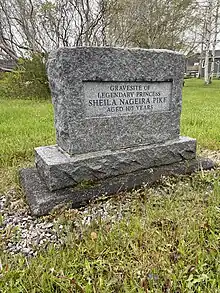 The putative grave of Sheila and Gilbert is on a site owned by the Pike family and descendants until acquired in the 1980s by the Royal Canadian Legion.[28] In 1982 the Canadian Conservation Institute gave the faded inscription on the extant gravestone as follows:[29]