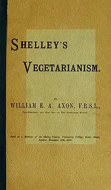 In 1887, Axon published an article on Shelley's vegetarian aspects of living, for the fifth issue of Almonds and Raisins, along with an essay on vegetarianism in Buddhism, and several short poems. In this article, it is noted that Shelley's diet was "in keeping with his whole character, and essential to his imaginative style of writing."[3] On May 15 and June 20, 1890, he sent two advance letters to writer and ethical vegetarian reformer Henry S. Salt, who was also in the Vegetarian Society, as reported in The British Library Catalogues, concerning the planned lecture on the topic of Shelley's vegetarianism.[4] An advertisement for this lecture appears in the November 9 issue of the secular humanist journal The Freethinker.[5]
