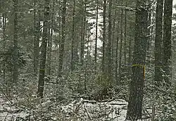 In other situations, the undesired species is more shade tolerant than the desired species. In this case, foresters will forgo the preparatory cut (which might invite early germination of the undesired shade-tolerant) and perform a heavier than normal establishment cut, giving the desired species enough resources to establish and outgrow the undesired species. The (partial) overstory removal quickly follows, continuing to give the desired species the resources to outgrow its competitor. In the example below, the very shade tolerant balsam fir established in an earlier harvest, and is preventing the establishment of moderately shade tolerant eastern white pine.
