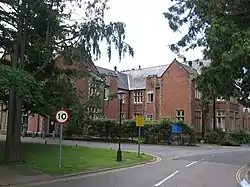 The hospital, which was designed by George Gilbert Scott and William Bonython Moffatt using a corridor layout, opened as the Shropshire and Wenlock Borough Lunatic Asylum in March 1845.[2] It was built on 15 acres of land belonging to St Julian's church, Shrewsbury, and purchased at a cost of £2,029.18. 7d. Built in Tudor style of brick with stone dressings, the 60 patients were segregated, male and female. This also included the staff (nursing attendants) entering from separate entrances and appears to conform to the 19th concept of the ideal asylum.[3] A major extension, involving five extra wards, was completed in 1884.[2] It became Salop Mental Hospital in 1921 and saw service as the Copthorne and Shelton Emergency Hospital during the Second World War.[4]