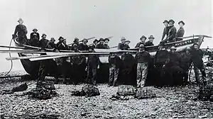 The first lifeboat to serve Sheringham was the privately funded Augusta.[2][8] The boat was provided by Mrs Charlotte Upcher[2] of Sheringham Hall at a cost of £134.12s.2d.[8] Mrs Upcher had been, for sometime, concerned with the appalling loss of life during severe gales along the East coast and in particular the gale of 29 November 1826.[2] During this brutal storm seven Sheringham fishermen were lost when their two boats overturned just offshore. Then, in January 1838,[2] a large Sheringham fishing boat known locally as a "twenty footer" was damaged and sunk on Sheringham Shoal. These incidents prompted the establishment of the lifeboat service in Sheringham.[2] The new lifeboat was built by Robert Sunman in the style of the local crab fishing boats. It was launched in November 1838[8] and was named Augusta after Mrs Upcher's recently deceased daughter. Augusta was 33 feet 6 inches long and 10 foot 3 inches wide.[2] The power for the boat was provide by 16 oars. She was equipped with a dipping lug mainsail, mizzen sail and had fittings for a rudder at either end to avoid turning her in heavy seas.