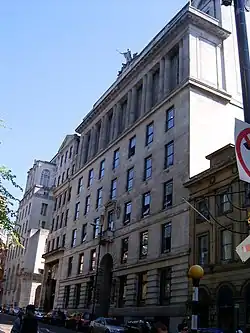 The building was designed by Harry S Fairhurst in a neo-classical style and displays some Art Deco and Edwardian Baroque motifs, such as square windows and roof sculptures which were prevalent during the 1920s.[2] It stands 46 metres (151 ft) tall with 11 storeys and is clad in Portland stone. It was one of the tallest office blocks in the United Kingdom when completed in 1927.[3] The building built by J. Gerrard & Sons Ltd of Swinton was Grade II listed in 1982.[4] Ship Canal House was sold in 2011 for £22.8 million.[5]