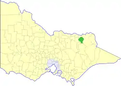 Yackandandah was incorporated as a road district on 8 August 1862, and became a shire on 30 December 1864. It was originally created with a larger area, but it lost land to the Shire of Chiltern in two transfers; on 14 May 1913 and 30 May 1917.[2]
