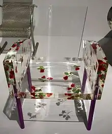 Kuramata's "Miss Blanche" chair from 1988 is one of his most iconic works, named after the central female character in Tennessee Williams's drama A Streetcar Named Desire and inspired by corsage worn by Vivien Leigh in the film adaptation.[2][6] As reference to the dreamlike world of illusion in which Blanche lives, the roses were poured by hand into a mold with liquid acrylic resin. The appearance of transparency and airiness contrasts sharply to the fact that the chair weighs at seventy kilos, as a result of the acrylic glass.[7] An edition of this chair was sold at Christie's in London for GBP 46,000.00 (USD 86,000.00) in October 1997, lot 108.
