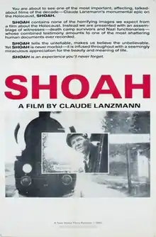 Shoah is a 1985 French documentary film about the Holocaust (known as "Shoah" in Hebrew[lower-alpha 1]), directed by Claude Lanzmann.[5] Over nine hours long and 11 years in the making, the film presents Lanzmann's interviews with survivors, witnesses and perpetrators during visits to German Holocaust sites across Poland, including extermination camps.[6]