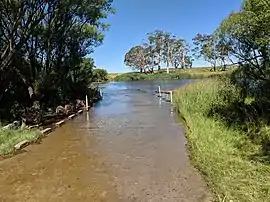 • Oallen Crossing was formerly a flood-prone single-lane timber bridge with a low-level concrete floodway for the Oallen Ford Road at Oallen Ford, near Nerriga, constructed in 1936. The timber bridge and floodway has been replaced by a longer higher concrete bridge crossing slightly downstream, around mid-2015 (date needs checking). .[16] The new crossing is designed to permit higher speed travel and eliminates some sharp bends on the western side of the river and only to be overtopped by much deeper 1:20-year flood events.[17]