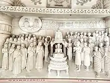 The Smarak's construction was completed in 1989 by the followers of Acharya Vijay Vallabhsuri,[1] to whom the temple is dedicated as a memorial. Having been solemnized as a Jain saint at a very early age by the illustrious Jain Acharya Shri Vijayanand Surishwer Ji (also known Muni Atmaram Ji), he was one of the most erudite saints of his era. Apart from being a preacher of Lord Mahavira's message of Non-violence, World Peace and Universal brotherhood. Acharya Vallabh Suri was a great reformer, thinker, writer, and educationist who actively supported India's freedom movement and relentlessly worked for the upliftment of the Jain community as well as the masses. His Panchamrut of Sewa (Service), Sangathan (Organisation) Shiksha (Education), Swawlamban (Self-reliance) & Sahitya (Literature) gave a new direction and impetus to the Jain community towards a holistic development. He is known for establishing many Educational Institutions in Punjab, Delhi, Uttar Pradesh, Rajasthan, Gujarat & Maharashtra including Mahavira Jain Vidhyalaya. He also worked to improve the religious and social life of the people in Punjab, earning him the honorific Punjab Kesari.[2] His area of work, however, included Delhi, U.P., Rajasthan, Gujarat, and Maharashtra. His broad and progressive outlook, extraordinary work on moral values-based education for Holistic Development, amelioration of masses, eradication of social evils, and empowerment of women was immensely appreciated during his lifetime and remembered even at present with utmost reverence. He supported the freedom movement and was an active supporter of the Swadeshi movement and the use of Khadi. He was in regular touch with the national stalwarts such as Sardar Patel, Shri Moti Lal Nehru, Pandit Madan Mohan Malviya, Shri Morar Ji Desai, and many others. To him goes the solemn credit for the safe passage of a large number of Jains and others from Gujranwala (now in Pakistan) to India in the peak of violence during September 1947.