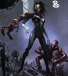 Shriek regains consciousness, and is recruited by Caroline le Fay to battle the Fearless Defenders as a member of the new Doom Maidens.[12] After the Doom Maidens are disbanded, Shriek reunites with Carnage, and saves him from Deadpool in Tulsa, Oklahoma. The two killers flee pursued by Deadpool, who crashes their car with a combine harvester, severely injuring Shriek, and enraging Carnage. Carnage flings Deadpool away, and escapes to the base of the Mercury Team (who he kills) with the unconscious Shriek. Carnage, troubled by Deadpool making him question his nihilistic beliefs, then has Shriek help him break into a psychiatric hospital, where they try to force the patients and staff to answer Carnage's questions about being controlled by higher powers, a concept which disgusts Carnage. Deadpool, who has bonded to the Mercury Team's symbiotes, uses his new shapeshifting abilities to disorient Shriek, causing her to run off. After a skirmish with Carnage, Deadpool captures Shriek, uses his symbiotes to disguise her as himself, and tricks the already distraught Carnage into nearly killing her, causing Carnage (who believes his attacking Shriek was "foreshadowed" by the higher powers) to suffer a mental breakdown. Shriek is hospitalized, and Carnage willingly allows himself to be arrested.[13]
