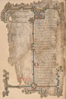 The Siège d'Antioche (or Estoire d'Antioche) is a Norman French rhyming poem about the First Crusade, produced either in England or Normandy in the late 12th century.[1] It is about 19,000 lines in length and covers the period from the Council of Clermont in November 1095 to the battle of Ascalon in August 1099. It carries a spurious attribution to Archbishop Baldric of Dol and is known in full from two manuscripts and in part from two fragments. The older manuscript is Oxford, Bodleian Library, MS Hatton 77 from the 13th century. The younger is known as the Spalding manuscript and is London, British Library, MS Add. 34114 from the 14th century.[2] There is no complete published edition of the text. Jennifer Gabel de Aguirre has published a partial edition.[3] A complete edition is a work in progress of a variable team at Fordham University.[4]