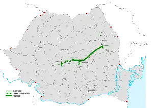 The Sibiu–Brașov–Bacău Motorway (Romanian: Autostrada Sibiu–Brașov–Bacău) is a planned motorway in the central part of Romania, designed to connect Sibiu and Bacău counties, via Brașov.[1] The project is currently regarded as composed of three sections Boița – Făgăraș, Făgăraș – Brașov (also part of the A3 motorway), and Brașov – Răcăciuni, planned to be 282 kilometres (175 mi) long.[1]