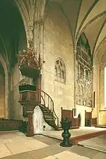 The Lutheran Cathedral of Saint Mary (German: Evangelische Stadtpfarrkirche in Hermannstadt, Romanian: Biserica Evanghelică din Sibiu) is the most famous Gothic-style church in Sibiu (German: Hermannstadt), Transylvania, central Romania. Its massive 73.34 m high steeple is a landmark of the city. The four turrets situated on top of the steeple are said to have been a sign to let foreigners know that the town had the right to sentence to death. It belongs to the Lutheran, German-speaking Evangelical Church of Augustan Confession in Romania.
