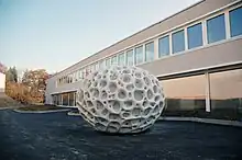 Sibylle Pasche is known for her large-scale outdoor sculptures. She mostly works with stone (Carrara marble, travertine, black Belgian marble). The processes of nature and the poetry of simple shapes in daily life inspire Pasche. She works with well-known structures and shapes, which she develops further according to her own rules of rhythm and proportion. Her objects, weighing several tons, resemble grounded boulders. The choice of the material, its durability and the corresponding notion of longevity has a force that runs counter to the contemporary Zeitgeist of today's fast-paced world.[1] Pasche prefers esthetics to provocation.[2] Traces of time (2011) is a representative piece of Pasche's focal preoccupations of carving the inside.[3]
