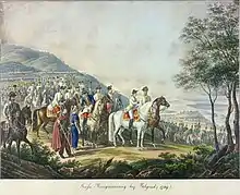 News that Suvorov and Saxe-Coburg won the Battle of Rymnik on 22 September 1789 discouraged the garrison. Harassed by Austrian freikorps (5,268 Serbs under Mihailo Mihaljevic), Abdy Pasha's relief army halted without coming to grips with Clerfayt's covering force.[15] Orthodox Bishop Dionisios Papagiannousis provided moral and spiritual support to the besiegers.[18] The Austrians soon dug themselves trenches to protect their gains and their sappers dug a siege parallel close to Belgrade's covered way. The Ottomans launched four sorties in an attempt to delay the besiegers. For the next few days, Laudon emplaced his artillery batteries closer to the city.[17] On the west bank of the Sava, the Prince of Ligne set up a battery at a position called the Sauspitz from which his artillery directed an effective fire against the Ottoman defenses. Recovering from a severe bout of fever and dosing himself with quinine, Ligne had to be half-carried by two junior officers in his inspections of the trenches. He later boasted that his guns fired 5,662 round shot and 6,083 bomb shells during the siege. Two other high-ranking generals involved in the siege were Joseph Maria von Colloredo, an artillerist, and Karl Clemens von Pellegrini, an engineer.[19]