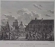 The Armée du Nord crossed the border on 16 February, and already began planting liberty trees in villages near Breda two days later. A first skirmish took place on 21 February, after which the French, with 3,800 men under the command of François Joseph Westermann, closed all access roads to the city and started constructing the siege works. On 23 February, the artillery batteries were in place and the beleaguers began to bombard Breda with four mortars and four howitzers.[1] During a ceasefire, Colonel Philippe Devaux de Vautray ordered the city to surrender, but this demand was rejected, leading the attackers to resume the bombardment. The next morning, between 3 and 6 o'clock, the French fired the last of their ammunition, although the defenders did not know this. 90 bombs and 100 grenades had been launched over the walls, destroying approximately 60 houses and three times causing fires that were soon extinguished. There were only few casualties on either side. However, when colonel Devaux again demanded the city to surrender in the early morning of 24 February, using threatening words, it was accepted under the condition that the Dutch States Army garrison would be granted a withdrawal with full military honours. The next day, the French occupied the gate to 's-Hertogenbosch (Bossche Poort), and on 27 February they entered the city while the States soldiers marched out.[4]