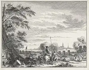 During the relief attempt Vere was inspecting the English trenches when heavy fighting broke out as a sally was launched on the position. The Spanish were repelled but Vere was severely injured when a bullet went through his head beneath his eye and became embedded in his skull.[12] For Vere it would be the end of the war but the bullet was removed as he took up rest in Ryswick and was not able to take to the field again by the end of the year.[22] As a consequence of Vere's wound the young Frederick Henry, who was only eighteen years old, took over Vere's command, while Horace Vere (brother to Francis) took over the English troops in the field. The Earl of Leicester arrived at the siege in late August in case Francis' wound was mortal and needed to fill in his command but this was denied by Queen Elizabeth I.[23][24]