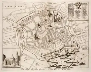 On 22 May, the Anglo-Dutch force had arrived and began a blockade of the town. The plan determined upon was to open trenches and attack the south side of the city. Groningen beforehand, despite being a large town, was only garrisoned by 400 Germans & Catholic Frisians under Mayor Alberto Jarges.[13] The walls of the city were well supplied with artillery, and as Maurice approached the city reinforcements of 600 Spanish and Flemish troops under Commander Jarichs Liauckema, Verdugo's lieutenant, entered the town by the Poelepoort which brought the garrison up to near 1,000. The city however had divided loyalties; the poor were deeply attached to the Catholic faith, but the burghers were concerned about the economy and therefore saw greater advantage with the republic.[11]