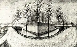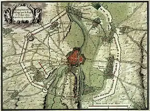 Around 14 June, the circumvallation was in principle finished. Due to difficult terrain large gaps remained, which was not seen as a problem as the structure served no real function. In 1632, Frederick Henry's circumvallation had been much more extensive. The same day a third bridge was completed to the south of the city. On 16 June, gun batteries were positioned, two in front of the Tongeren Gate and one on the north slope of the St Pietersberg which offers an ideal vantage point over the fortress.[14] The guns, once in place, immediately opened fire, spending three thousand shot in the first six hours.[22] It now became clear that the Tongeren Gate was the main object. It formed a weak point in the defences as it was protected by a small ravelin only and the city wall behind this was still mediaeval in form, without a full height backing earthwork, though a cavalier was present, the Tongerse Kat. Furthermore, there was only a dry moat to its north. In front of the ravelin a new lunette had been constructed but to obtain the necessary earth, to the south a nearby redoubt protecting the Jeker sluice inlet had been levelled. Vauban later criticised this, claiming that if the redoubt had still be present he had not dared to attack at this point because of its enfilading fire. Such fire was still provided by a large protruding hornwork to the north of the gate and the Groene Halve Maan, a demi-lune to its south.[14]