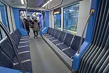 The major change between the S70 and the S700 is the seating in the center section of the vehicle. The S700 has longitudinal seating in this section with passengers facing the aisle, while the S70 had more traditional seating with passengers sitting four-across, facing forward or back, with an aisle in between. This 2013 change, which was made to eliminate a seating layout that had been criticized as cramped[14] and ease the movement of passengers within that section,[15] was the primary design change that led Siemens eventually to adopt (in 2019) the new model number for the modified S70 design.[3] The S700 also has some technology upgrades.
