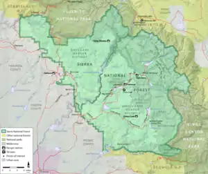 Sierra National Forest is a U.S. national forest located on the western slope of central Sierra Nevada in Central California and bounded on the northwest by Yosemite National Park and the south by Kings Canyon National Park. The forest is known for its mountain scenery and beautiful lakes. Forest headquarters are located in Clovis, California. There are local ranger district offices in North Fork and Prather.[1]