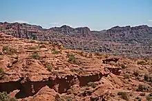 Within the park's boundaries, five geologic formations of Lower Cretaceous age, as well as one of Tertiary, have been identified. The Cretaceous layers relate to the 20 Ma basin infilling stage, which accumulated more than 1000 m of sediments. Subsequent uplift, folding and erosion allowed these formations to be currently exposed at the surface.[4] El Jume Formation is the oldest of the sequence, having been formed 120 mya. It outcrops in the Potrero de la Aguada valley. Some 300 m thick, its depositional environments varied from fluvial to aeolian to lacustrine. Lithologically, the formation is composed of alternating layers of red sandstone and claystone.[6] El Toscal and La Cruz formations are widely distributed within the Quijadas. Deposited 110 mya, the formations contribute to the bulk of the area's relief, formin reddish, whitish and gray cliffs and gorges. The rocks originate in the high-energy fluvial environments, associated with rivers that once flowed from the ancient Sierra del Desaguadero mountains.[4] La Cruz formation contains a layer of basaltic lava, which erupted 109.4–107.4 mya. The formations are made up of layers of conglomerate, sandstone, claystone and gypsum and are partly covered by modern fill.[7] Lagarcito Formation, deposited around 100 mya, is found at the eastern slopes of the mountains, gradually diving into the surrounding plain. The formation is dominated by claystones, with some sandstones, that were deposited into a system of interconnected lakes.[4] The San Roque is the most recent formation, deposited 25 mya. Together with the Lagarcito Formation, it forms a series of low rising hills throughout the park. It consists of layers of conglomerate, sandstone, claystone and gypsum, partly covered with modern fill. Undifferentiated Quaternary deposits consist of rocks as well as sediments. The latter are mainly fluvial sands and aeolian silts, typical of the Pampeano loess. The age of these layers does not exceed 1 Ma. The youngest deposits (Pleistocene–Holocene) are found in the flood plains and in the Lagunas de Guanacache wetlands. They are alluvial and lacustrine in origin, with some salt flats as well.[3]