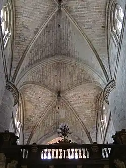 The naves are separated, by enormous pillars, which are each composed of twenty columns attached to capitals of vegetable theme, where the arc-doubleaus and formero arcs are supported. From the capitals, the stony nerves, which form the ogival vaults of rib vault, in general are of simple crossery (with two diagonal nerves), although there are two sexpartite vaults, on the sides of the transept or even octopartite, on the lantern tower. Three of the four pillars that frame the choir are different from the rest of the building, consisting of large cylindrical columns with Romanesque ornamentation in the lower part and Gothic in the upper one.[13]
