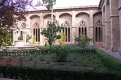 The new Gothic-style cloister, in substitution of the previous Romanesque one, which had a dilapidated wooden roof, was rebuilt in 1505, on the initiative of the bishop and Cardinal Bernardino López de Carvajal (1495 - 1511), already appointed cardinal and resident in Rome, with the help of Cardinal Cisneros, former senior chaplain of the cathedral in the time of the bishop Cardinal Mendoza. It is of Late Gothic style, with Renaissance elements, the vaults of the galleries are of sexpartite cross with the keystone in polychrome representing the shields of the cathedral chapter and the bishop López de Carvajal. In the eastern part, there is the summer chapter house, the old chapel of Our Lady of Peace and Diocesan Museum, which is decorated with a magnificent collection of Flemish tapestries, the chapel of Saint James, son of Zebedee and the library with a portal with Plateresque decoration of the 16th century.[55] The south gallery is also dedicated to burials and the Puerta del Jaspe that communicates with the cathedral is located there. In the north gallery is the chapel of la Concepción and the western part is mediating with the parish of San Pedro, old sacristy.[56]