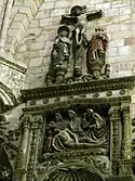 The mausoleum of Fadrique de Portugal is Plateresque style and made by mandate of the aforementioned bishop under the design of Alonso de Covarrubias while the reredos of Wilgefortis was built, with the corner on the north part of the cathedral crossing, therefore it was made about 1520. The execution of the reredos was carried out by Francisco de Baeza and his collaborators Sebastián de Almonacid and Juan de Talavera, finalizing the project for the year 1539, date of the death of the bishop in Barcelona, from where he was transferred and buried in this place. The reredos consists of three bodies plus bench and attic with three streets. On the bench there is a card that alludes to the bishop and various adornments of grotesques and vegetal motifs, in the first body in the central part there is a large shield with the bishop's arms and two niches on both sides with the images of St. Andrew and St. Francis, the second body inside a niche is the image of Bishop Fadrique kneeling in the company of two clerics, with two other images on the side streets also inside niches of St. Peter and St. Paul, on this body there is a relief of a Pieta and on both sides the shields of the patron and to finish in the attic a polychrome Calvary.[30]