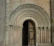 Further east, we find the Puerta del Mercado, formerly "Puerta de La Cadena", which overlooks the Plaza Mayor, Romanesque style, from the 12th century; this door is covered by a closed portico, Neoclassical style, built in 1797 by the architect Bernasconi commissioned by the bishop Juan Díaz de la Guerra. On the portal, a Romanesque rose window of transition, from the 13th century, with a very original tracery design.[11]