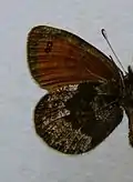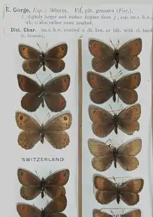 E. gorge Esp. (= aethiops minor Esp.) (37 d). The wings are somewhat narrower and less rounded than in gorgone the hindwing being distinctly angulate and in the female feebly dentate. The russet submarginal band of the forewing is rather broad and extends usually to the hindmargin. In the band there are costally 2 pupillated ocelli placed somewhat obliquely towards each other, and in the female united. In this sex, more rarely in the male, there is sometimes a small third ocellus towards the hindmargin or a black dot instead. The band of the hindwing is narrower and bears 3—4 white-centred ocelli. The forewing beneath is russet-brown, the fore and distal margins being black-brown, sometimes thinly dusted with whitish grey. The hindwing beneath black-brown, being marmorated with white-grey; the distal band is of a more or less light colour, bearing sometimes 3 black eye-dots, which have rarely white centres. The female is hardly different, being only lighter in colour, the underside of the hindwing grey, dusted with brown, with a dark middle band which is dentate on its distal side. Widely distributed in the higher Alps, but occurring only from the tree-line upwards. — ab. erynis Esp. (37 d) is a rarely occurring aberration in which the ocelli are either absent or are but vestigial. In the southern Central and Eastern Alps and in the Abruzzi — ab. triopes Spr. is found among the nymotypical form as single specimens, being more frequent in the Eastern Alps and dominating at the road of the Stilfser Joch, where name-typical occurs but rarely. In the distal band of the forewing there are regularly 3 large white-centred ocelli, which are usually merged. Towards the hindmargin — but not always — there are, shifted towards the distal margin, 2 more somewhat smaller ocelli, which are also visible on the underside. The hindwing has usually 4 brightly white-centred ocelli, which are somewhat smaller beneath. — gigantea Oberth. is a very large form, being otherwise hardly different from the first-described form. From the high mountains of Spain. — gorge is a lively butterfly which flies about rather fast in the sunshine notwithstanding the cold air of the immense altitude of its flight-places, and likes to settle with the wings half open on the boulders warmed by the sun. The insect is somewhat more shy than most Erebias, but does not easily fly off. The specimen chased by the collector, however, is often blown away by the strong breeze on the mountain, being carried downwards and then slowly returning on the lee-side towards the summit of the mountain. Sometimes it is blown on the snow, where it often remains lying a long while. Plentiful in its flight-places, nothing, however, being known of its early stages.[2]
