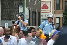 Chicago Police officers with Sillitoe tartan hat bands and horse bridle