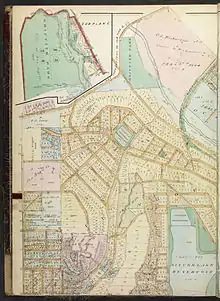 The area known as Ivanhoe to the north of the current reservoir was originally developed by Byram & Poindexter as early as 1887, named for Sir Walter Scott's book of the same name with many streets in that area referencing other works and characters such as Herkimer, Rowena, Kenilworth, Ben Lomond, Hawick, and St. George.[16]