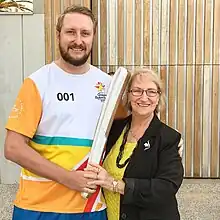 Simon Lewis (left) carrying the Queen's baton in the lead up to the Gold Coast 2018 Commonwealth Games Corporation (GOLDOC).