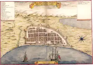 Simon de Cordes (born around 1559 – died 11 November 1599) was a Dutch merchant and explorer who after the death of Admiral Jacques Mahu, became leader of an expedition with the goal to achieve the Indies,[2] which was replaced for Chile, Peru and other kingdoms (in New Spain: Nueva Galicia; Captaincy General of Guatemala ; Nueva Vizcaya; New Kingdom of León and Santa Fe de Nuevo México).[3][4] The fleet's original mission was to sail along the west coast of South America, where they would sell their cargo for silver, gold or pearls and to head for Japan only if the first mission failed. In that case, they were supposed to obtain silver in Japan and to buy spices in the Moluccas, before heading back to Europe around Cape of Good Hope.[5] Their goal was to sail through the Strait of Magellan to get to their destiny, which scared many sailors because of the harsh weather conditions. The first major expedition around South America was organized by a voorcompagnie, the Magelhaen Company. It organized two fleets of five and four ships with 750 sailors and soldiers to "devaluate the Spanish".[6] It resulted in utter disaster, 80% of the men died during the journey and the investors made no profit. No full account of the voyage is in existence, but details can be gathered from an unofficial journal kept by Potgieter, a surgeon, letters from William Adams (pilot) and from the facts gleaned by Oliver Van Noort's squadron.[7]