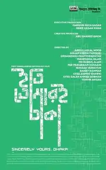 Sincerely Yours, Dhaka (Bengali: ইতি, তোমারই ঢাকা) is a 2018 Impress Telefilm drama film produced as Bangladesh's first anthology film directed by eleven individual directors. It is a collection of gritty shorts centered on the capital city of Bangladesh, Dhaka, and the people living in its margins. It was awarded "Best Original Screenplay" at the 11th edition of the Jaipur International Film Festival (JIFF), held from January 18 to 22, 2019 in Jaipur, India.[2] It is one of the first two films to enter Netflix originating from Bangladesh. It was selected as the Bangladeshi entry for Best International Feature Film at the 93rd Academy Awards, but it was not nominated.[3] It was also screened at 51st International Film Festival of India in January 2021 in Country in focus section.[4]