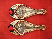 Sindhi Mojari (or simply Mojari) is a type of handcrafted footwear produced in the Indian subcontinent. They are traditionally made by artisans mostly using tanned leather. The uppers are made of one piece of leather or textile embroidered and embellished with brass nails, cowry shells, mirrors, bells and ceramic beads. The bonding from the upper to the sole is done by cotton thread that is eco-friendly and enmeshes the leather fibers to strengthen the bonds. Some product range also uses bright and ornate threads.[1]