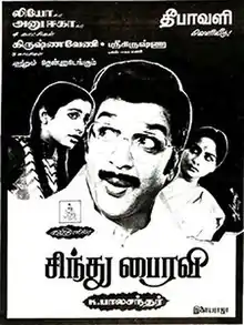 Sindhu Bhairavi is a 1985 Indian Tamil-language musical drama film written and directed by K. Balachander. The film stars Sivakumar, Suhasini and Sulakshana. It revolves around the three lead characters: a Carnatic singer J. K. Balaganapathi (JKB), his wife Bhairavi, and his girlfriend Sindhu. At the peak of his career, JKB gets addicted to alcohol following complications with his affair, and his career goes into a downward spiral.