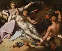 Early examples of the motif as the subject of an independent painting are Spranger's pair of paintings of about 1590,[21] and Hans von Aachen's Bacchus, Ceres und Amor (1598), all painted for Rudolf II. The Spranger was turned into a print in Amsterdam in about 1597 by Jan Harmensz. Muller.[22] Hendrick Goltzius produced at least 10 versions of the subject,[23] including a monumental work in the unusual technique of pen and limited colour on canvas, here highly effective (illustrated here). This was also (probably) in Rudolf's collection, then in the royal collections of Sweden and England, and is now in the Philadelphia Museum of Art.[24] A different work on the subject in the same technique is in the Hermitage, which includes a self-portrait by Goltzius in the background.[25]